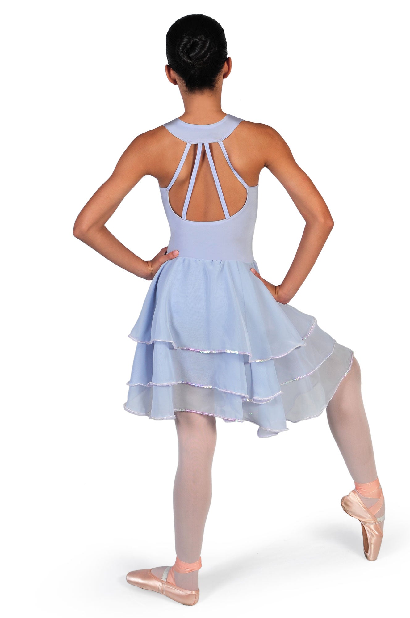 O rochie pentru dans clasic și modern foarte rafinată, care se va potrivi și coregrafiilor îndrăznețe de musical și unor dansuri de salon. body din lycra prezintă pe spate un evantai de bretele subțiri prinse la gât în stil american. Fusta este compusă din trei straturi de chiffon de lungimi diferite, tivite cu surfilare pentru a oferi mai mult volum și iluminate de un fir de paiete.